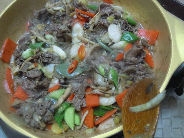 마지막으로 익혀줍니다.당면과 떡 그리고 고기가 다 익었을때는