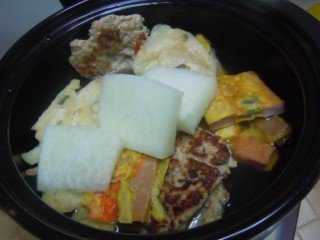 모듬전 전골 재료 : 각종모듬전(620g), 작은양파1개(80g), 무(16g),