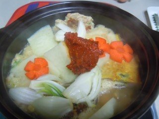 * 전과 각종야채가 들어간 전골이 끓기시작하면 양념장을 넣어주시고 잘 풀어주세요.