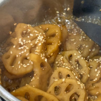 냉동연근 500 물800 간장6 설탕4 올리고당 4 식용유1 양념넣고 뚜껑닫고 20분 중간불로 끊이다 반으로 쫄면 약불로 마무리 견과루5숟가락 50cc7숟가락