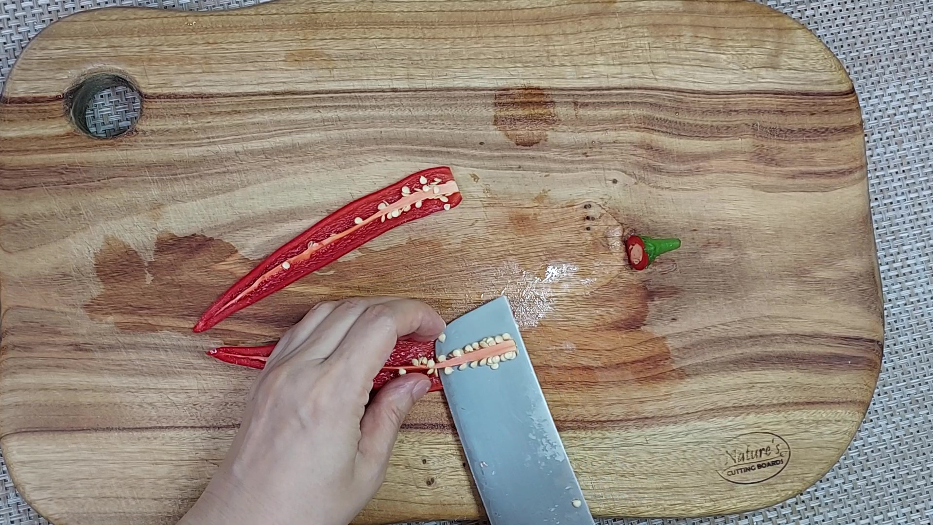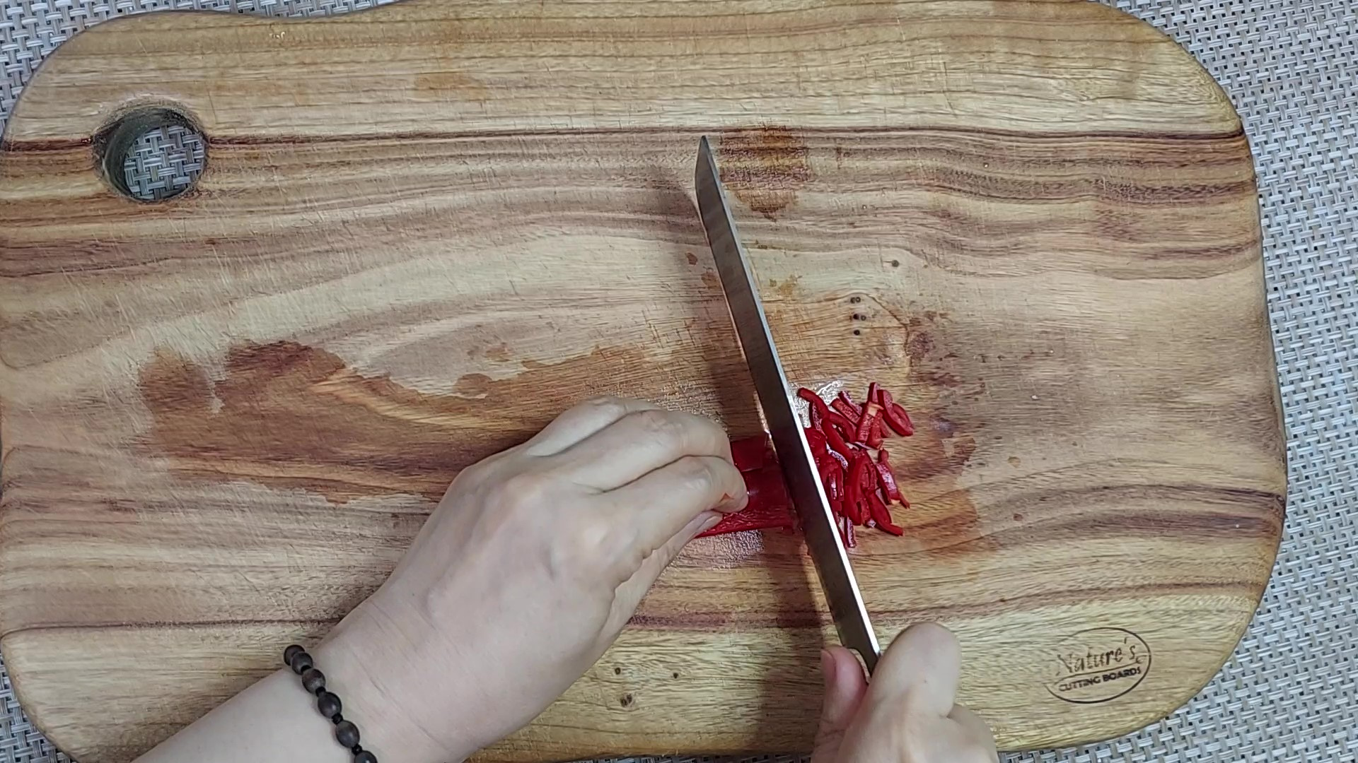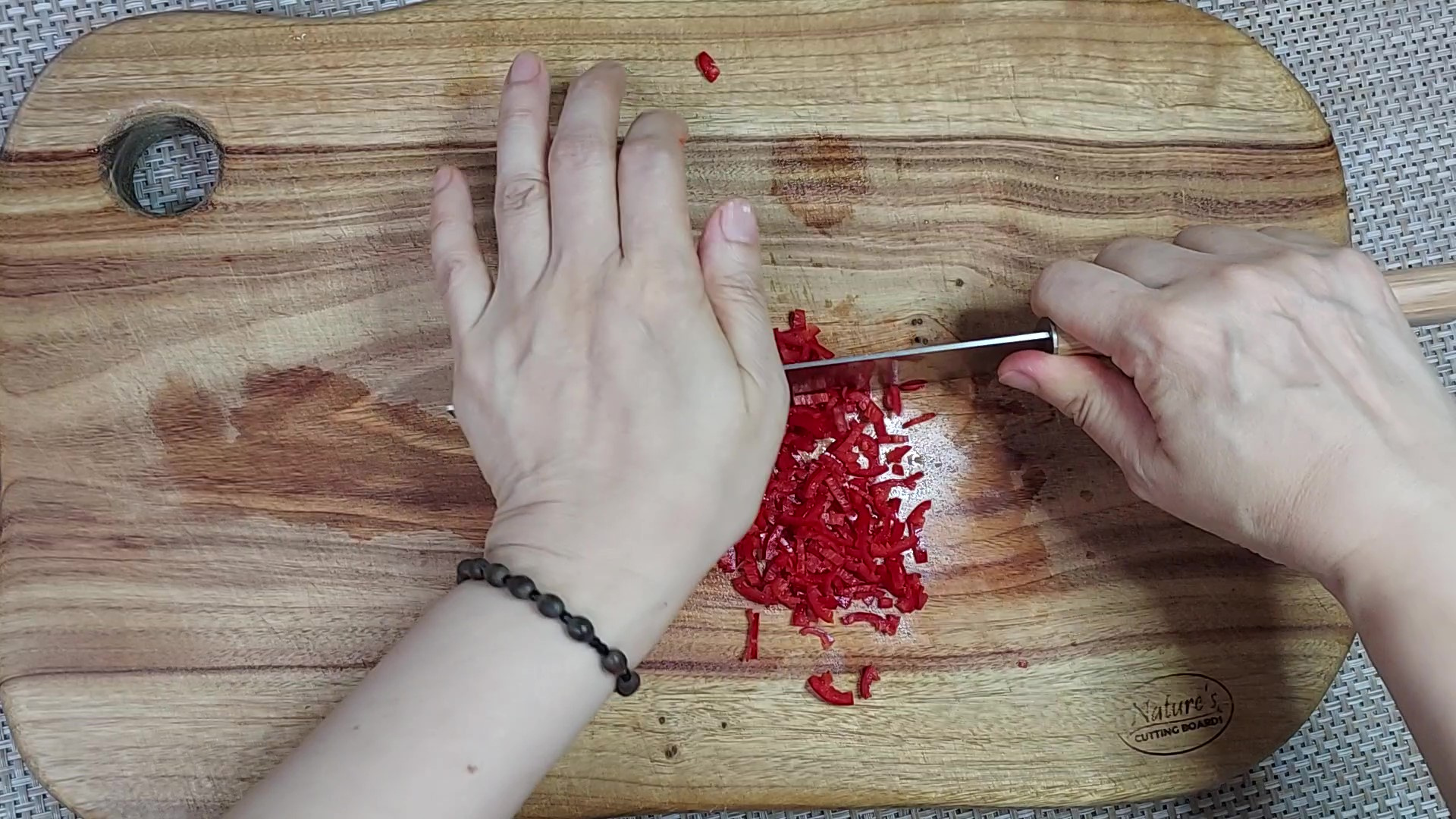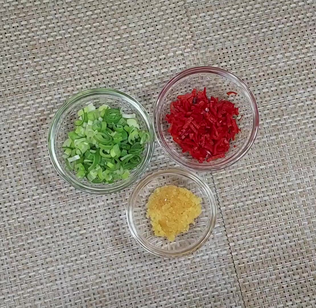 홍고추는 가운데 씨를 제거하고 채 썬 후 약간 다져서 준비해 주세요.