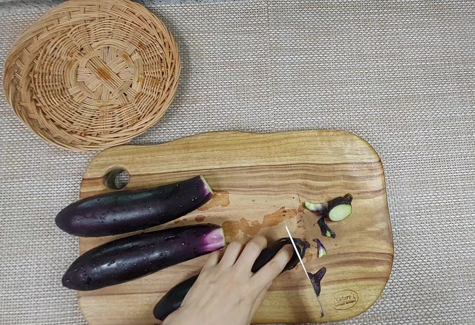 가지를 개끗이 씻은 후 꼭지를 제거해 주세요.