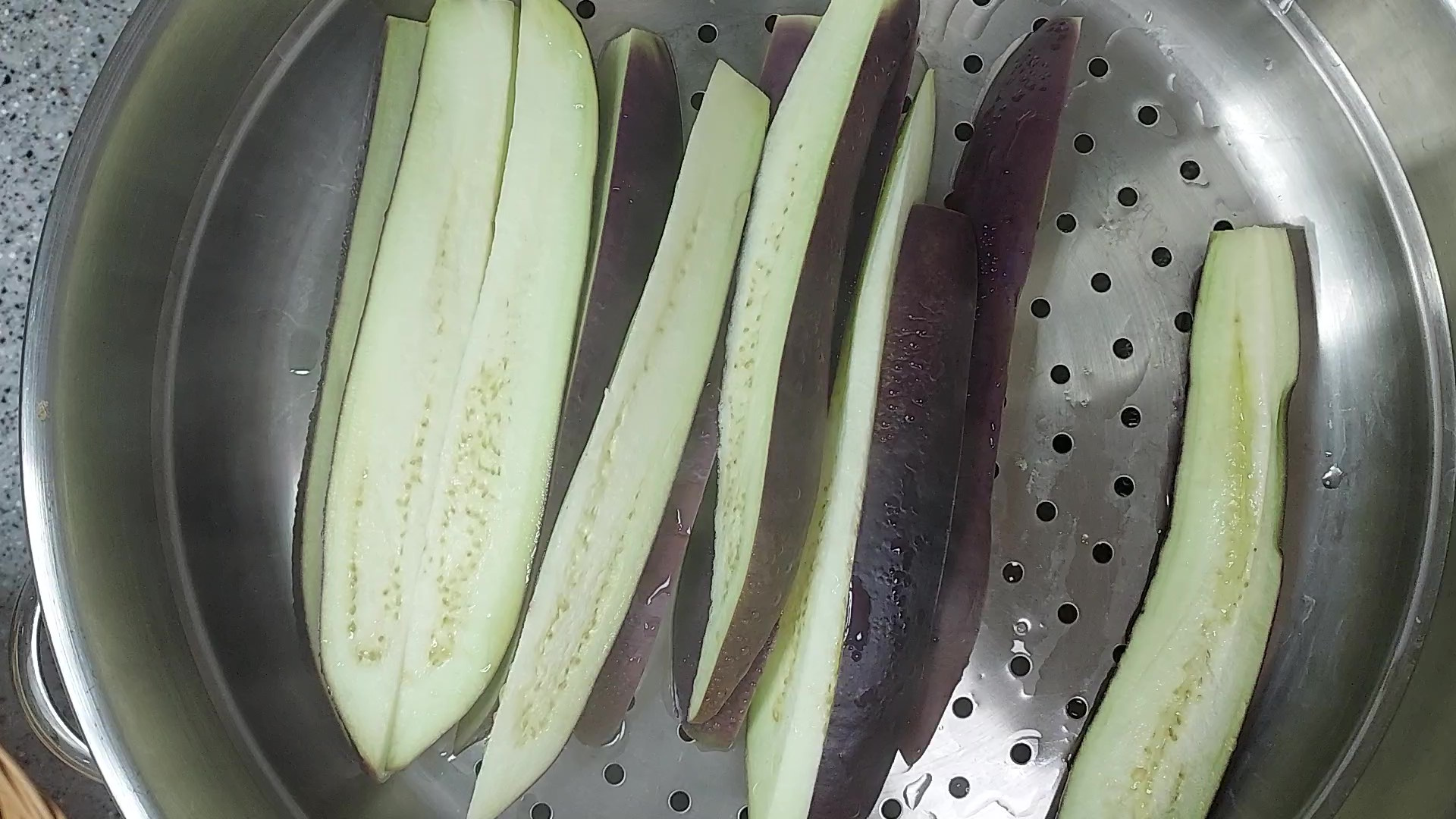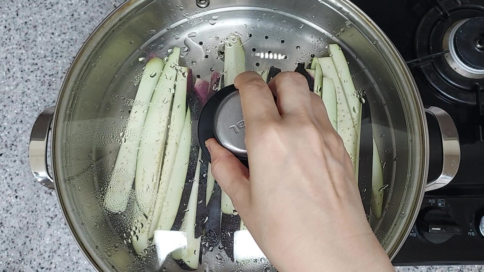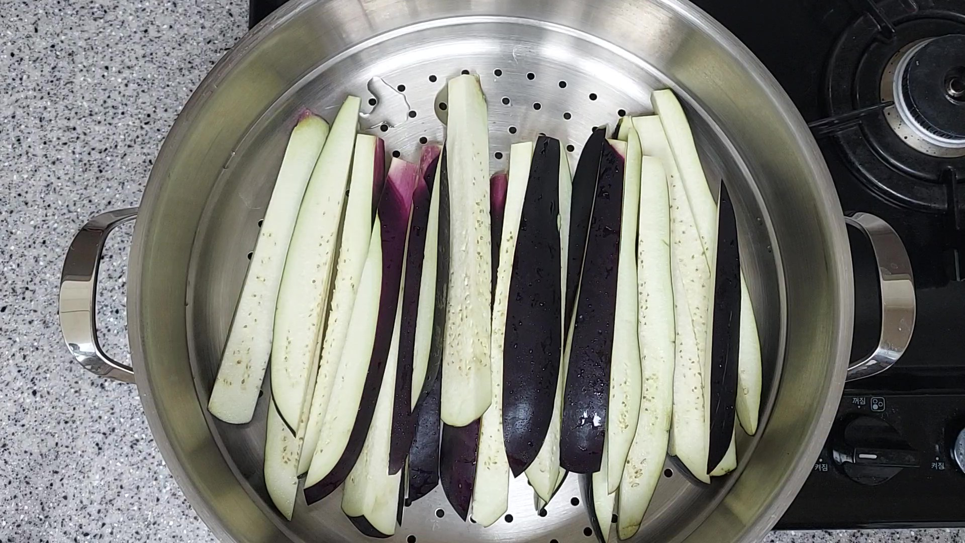 김이 오른 찜기에 가지를 올려주새요.