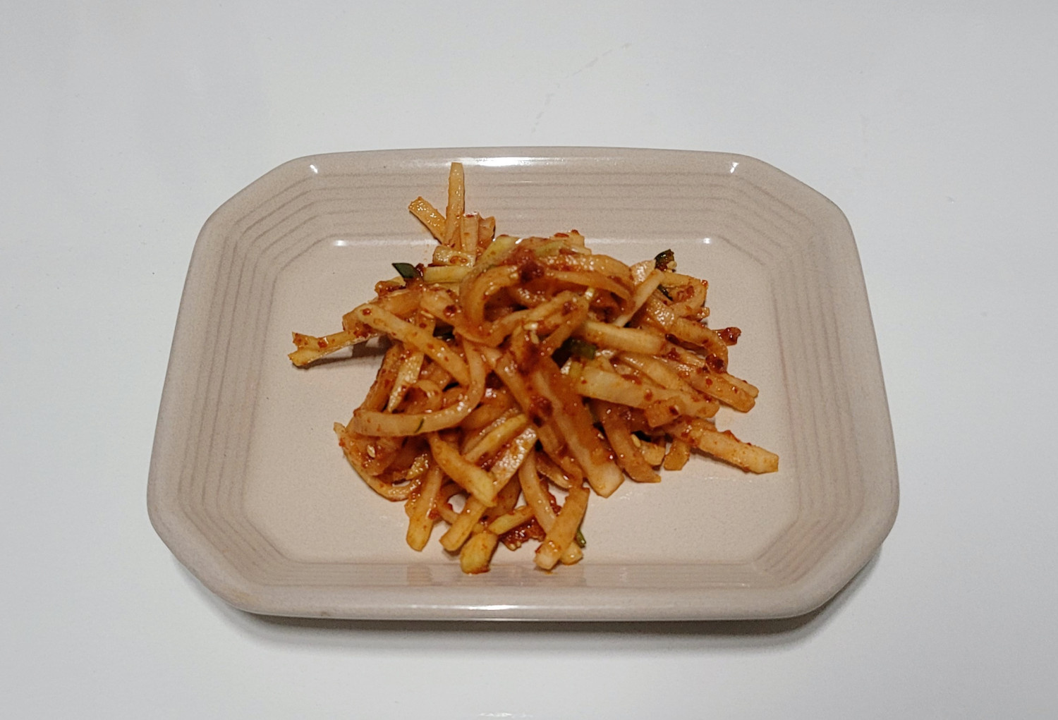 새콤달콤한 양념이 매력적인 아삭한 무생채입니다.