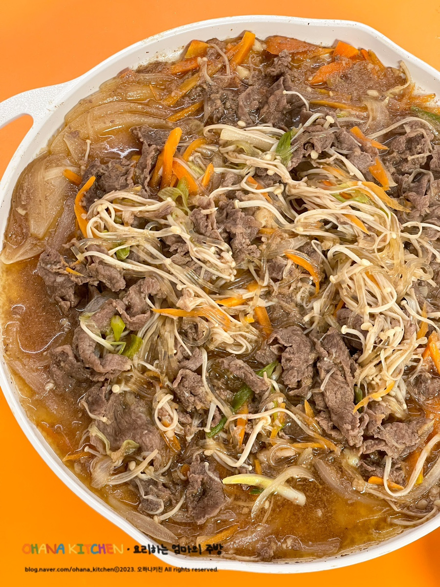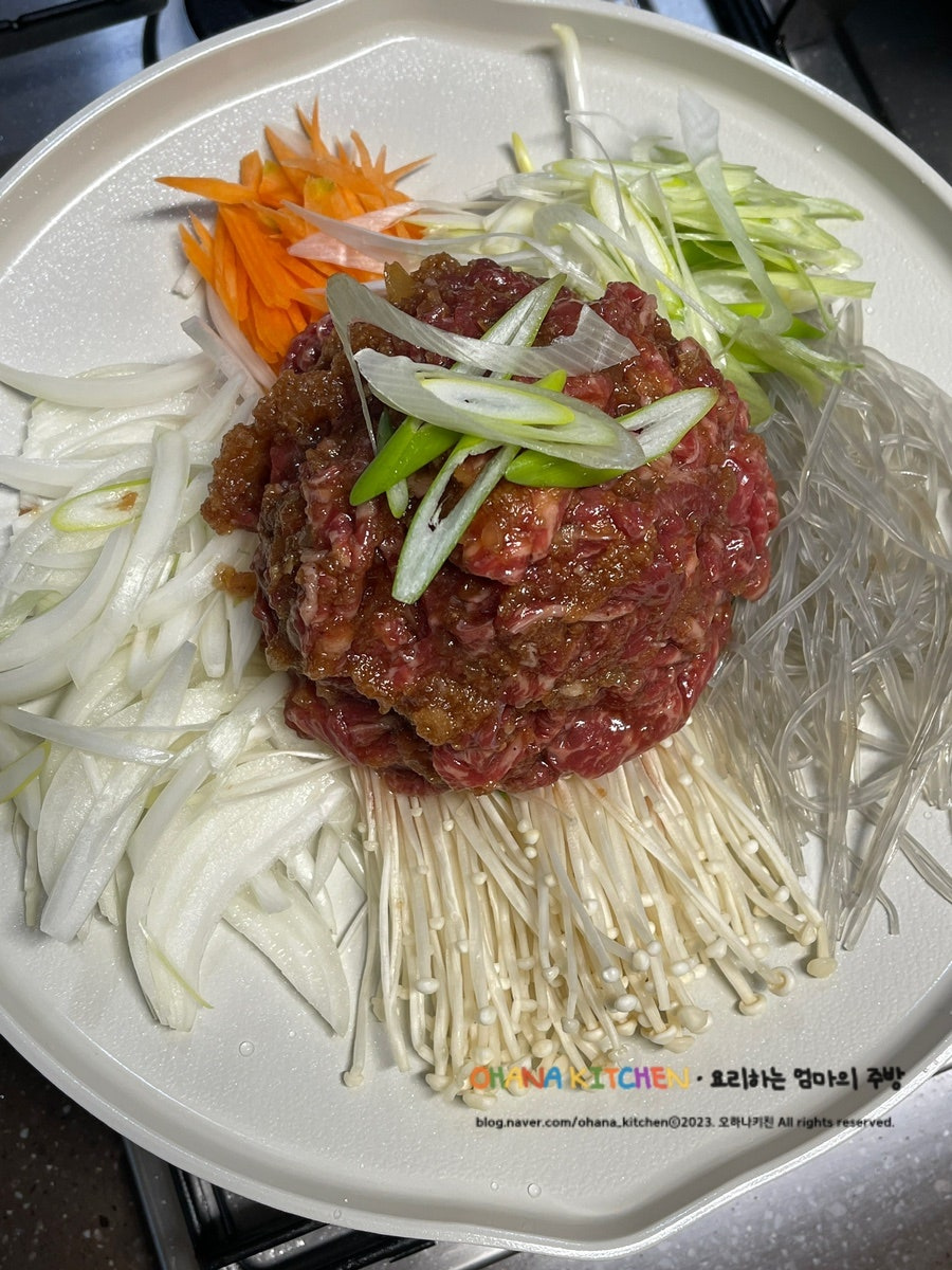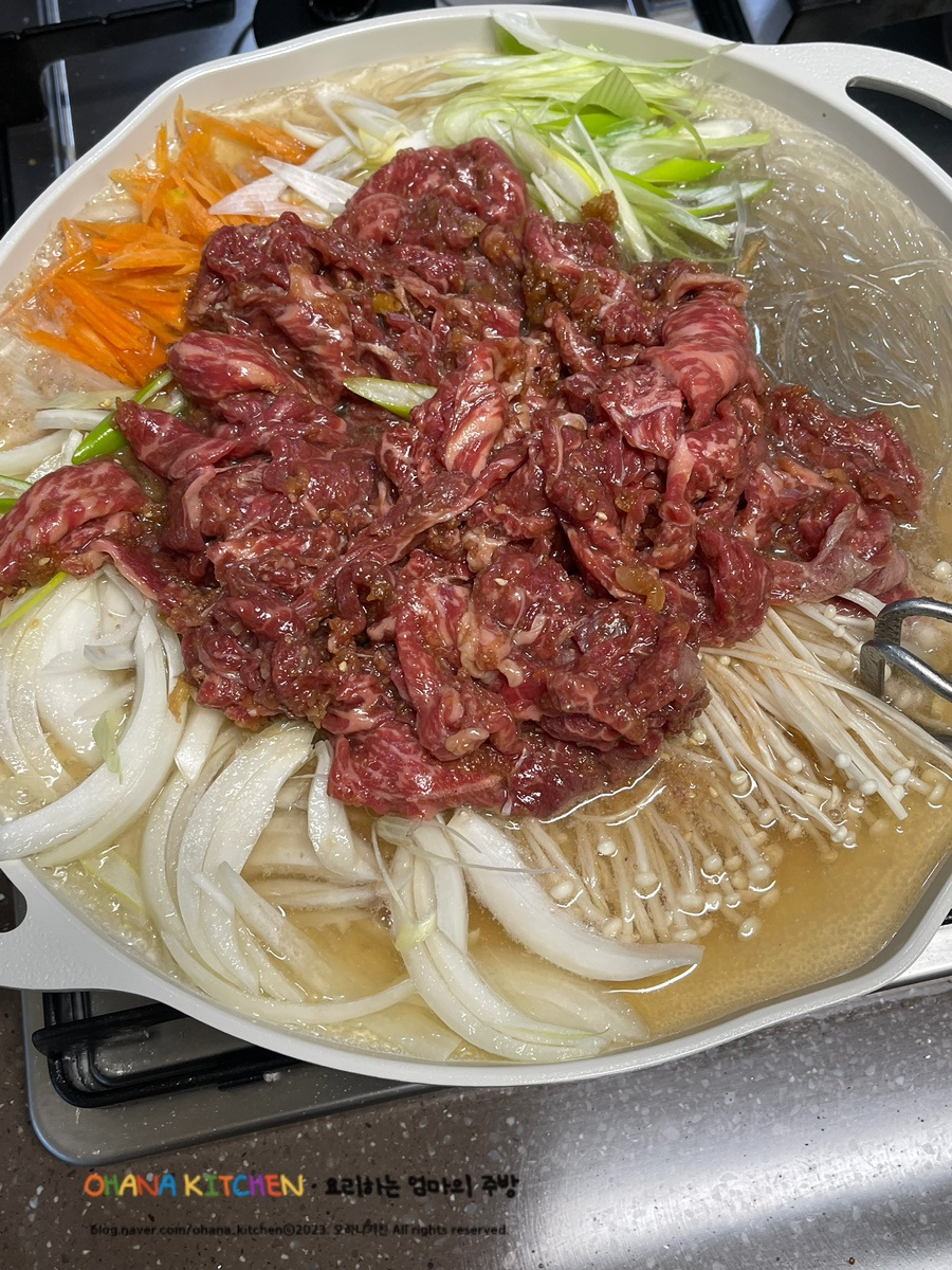 오늘은 어른, 아이 모두가 맛있게 먹을 수 있는 소불고기전골을 만들어서 맛있게 저녁을 먹었어요. 소불고기를 달큰한 간장양념에 재워 버섯,양파, 대파, 당면과 함께 끓여내 먹을 수 있는 불고기 전골은 아이들이 가장 좋아하는 고기 반찬 중 하나랍니다. 방학을 맞이한 아이들을 위해, 고기 없으면 밥 안 먹는 신랑을 위해서도 딱 좋은 메뉴, 불고기 전골 만들기를 시작해 볼까요?