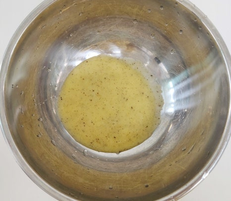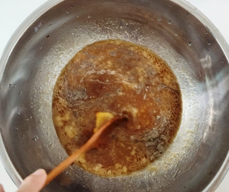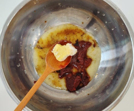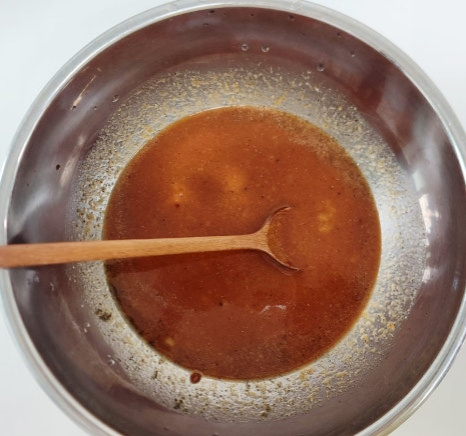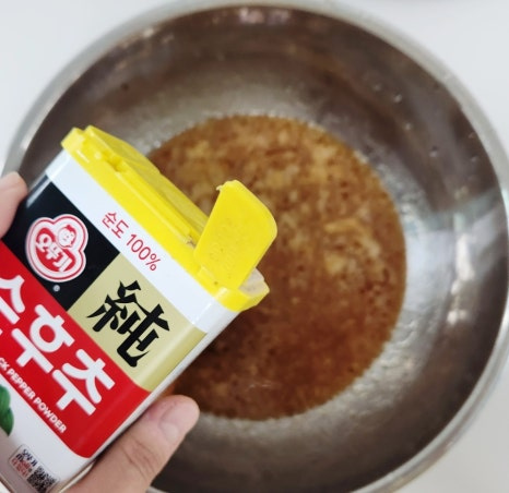여기에 갈아만든배 200ml, 맛술 2T, 후춧가루 0.5T 정도 넉넉하게 넣은 후 양념장을 골고루 잘 섞어 주세요.