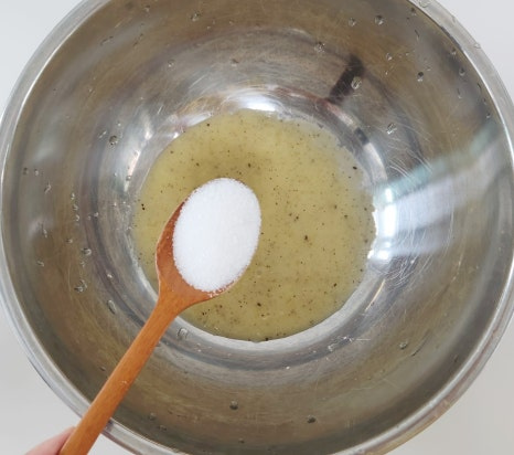 큰 볼에 갈아놓은 키위를 넣고 설탕 2T를 넣어 주세요.