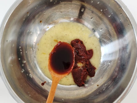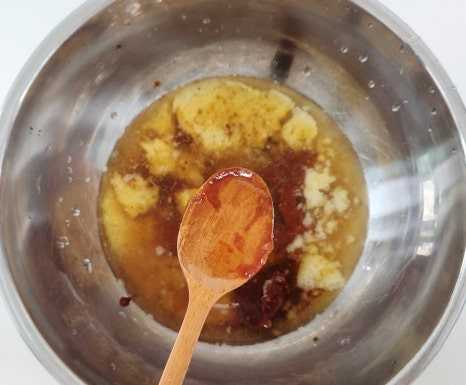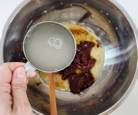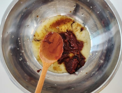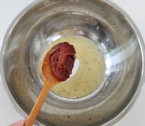 여기에 고추장 3T, 진간장 3T, 참기름 2T, 다진마늘 1T를 넣어 주세요.