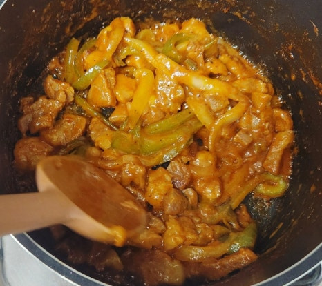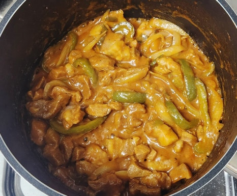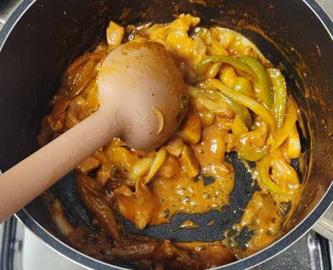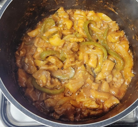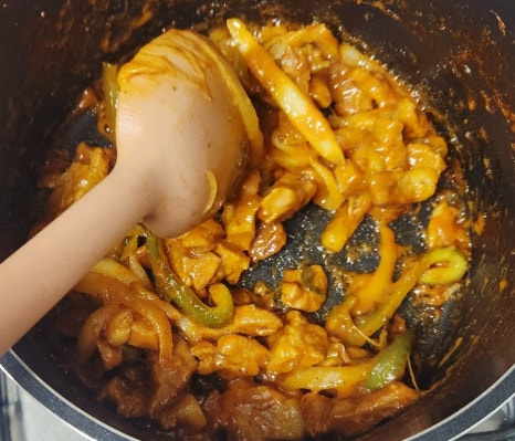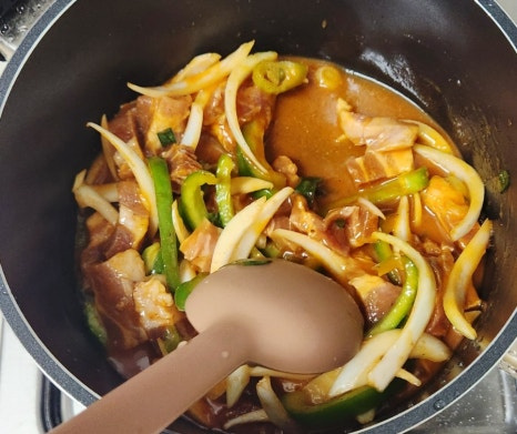물이 졸아들기 시작하면 불을 약불로 줄이고, 고기 겉면이 살짝 눌어붙을 정도로 그대로 두어 카라멜라이징을 합니다. 자주 저으면 눌어붙지 않기 때문에, 이때는 조금 기다리는 것이 포인트입니다. 카라멜라이징을 통해 양념이 농축되면서 깊은 맛과 고기 표면의 윤기가 살아날 거예요.