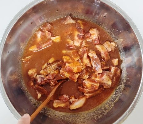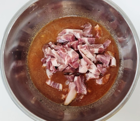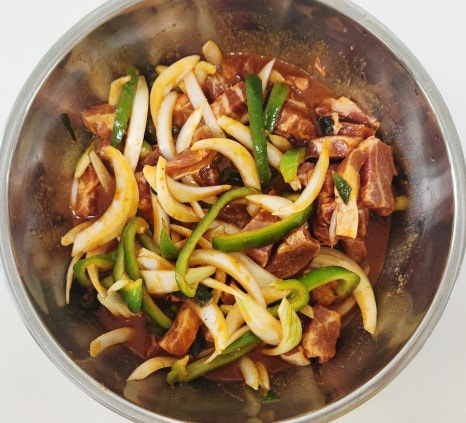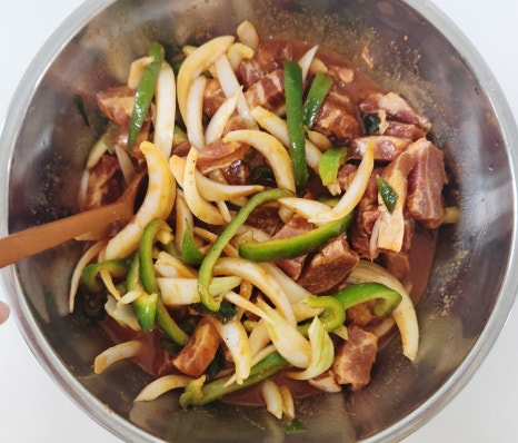 준비된 돼지고추장불고기 레시피 양념장에 썰어놓은 목살을 모두 넣어 주세요. 그리고 한차례 섞어 줍니다.