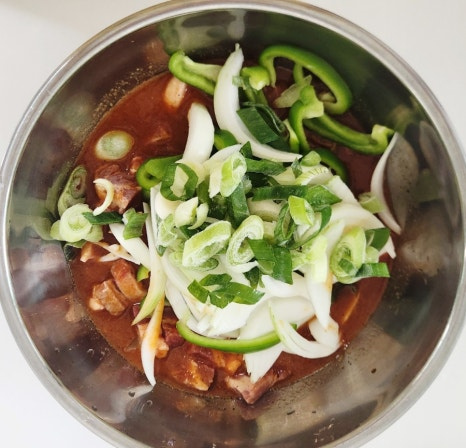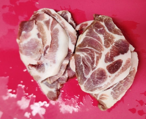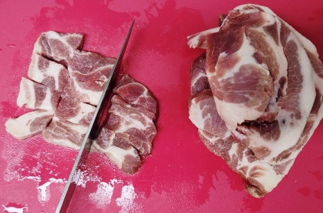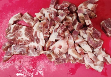 핏물을 뺀 목살은 먹기 좋은 크기로 썰어줍니다. 너무 작게 썰면 볶을 때 식감이 떨어지니 적당히 도톰하게 써는 게 좋아요.