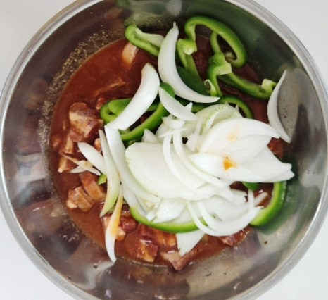 여기에 미리 손질해둔 양파, 파프리카, 대파도 함께 넣고 잘 섞어주세요. 이대로 30분 이상 숙성하면 양념이 더 깊이 배어 맛있어요.