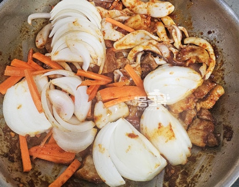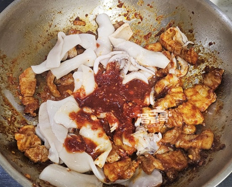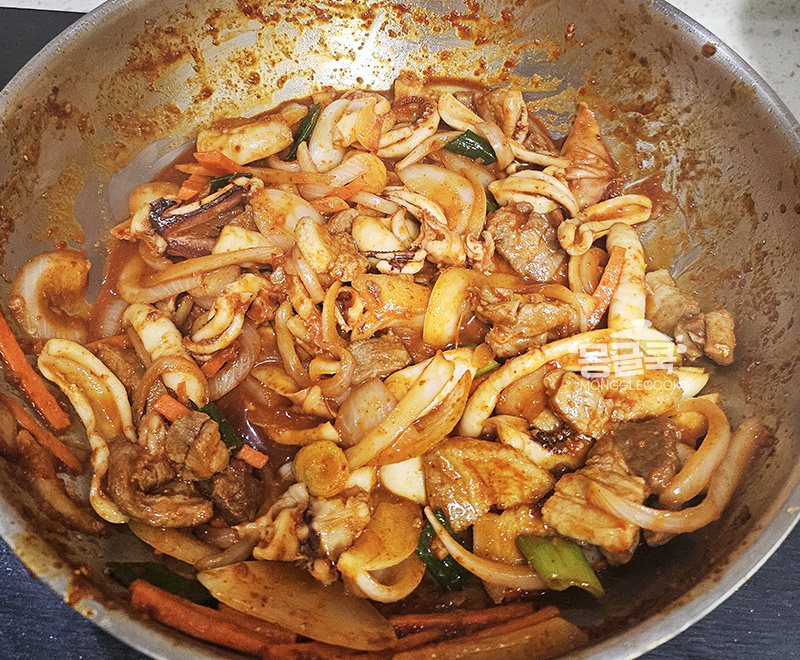 강불로 올리고 오징어와 남은 양념장을 전부 넣어 빠르게 뒤집어가며 볶아주세요.