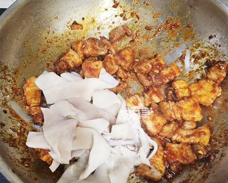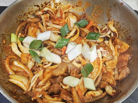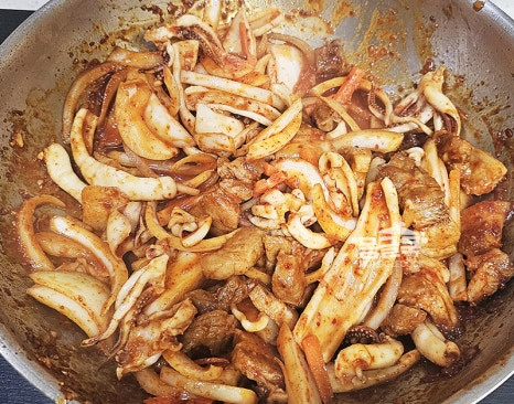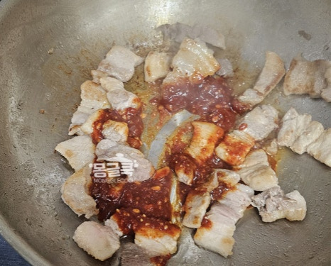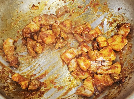 중불로 줄이고 양념장 절반을 넣고 고기와 섞으며 20~30초 정도 볶아 향을 올려주세요.