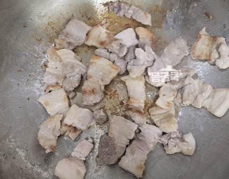 강불에서 삼겹살을 펼쳐 3~4분 굽듯이 볶아 겉면을 갈색화를 해주세요.