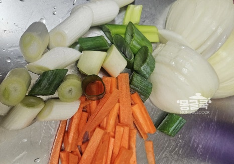양파, 당근을 먼저 40~60초 볶고, 대파를 넣고 30~40초 볶아주세요.