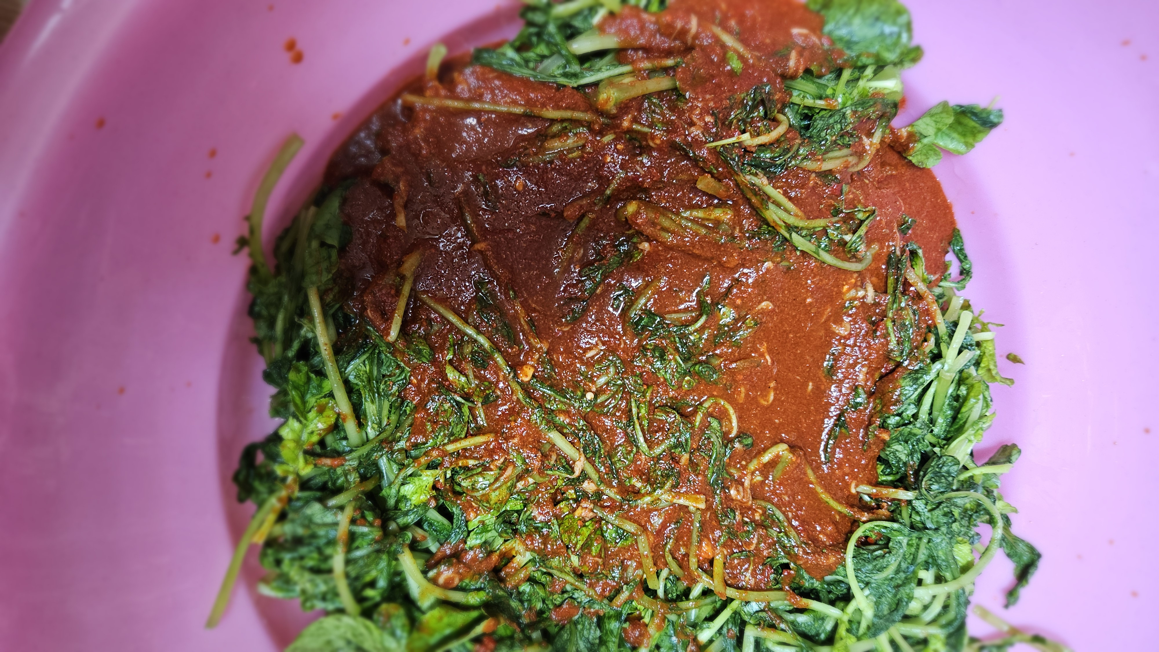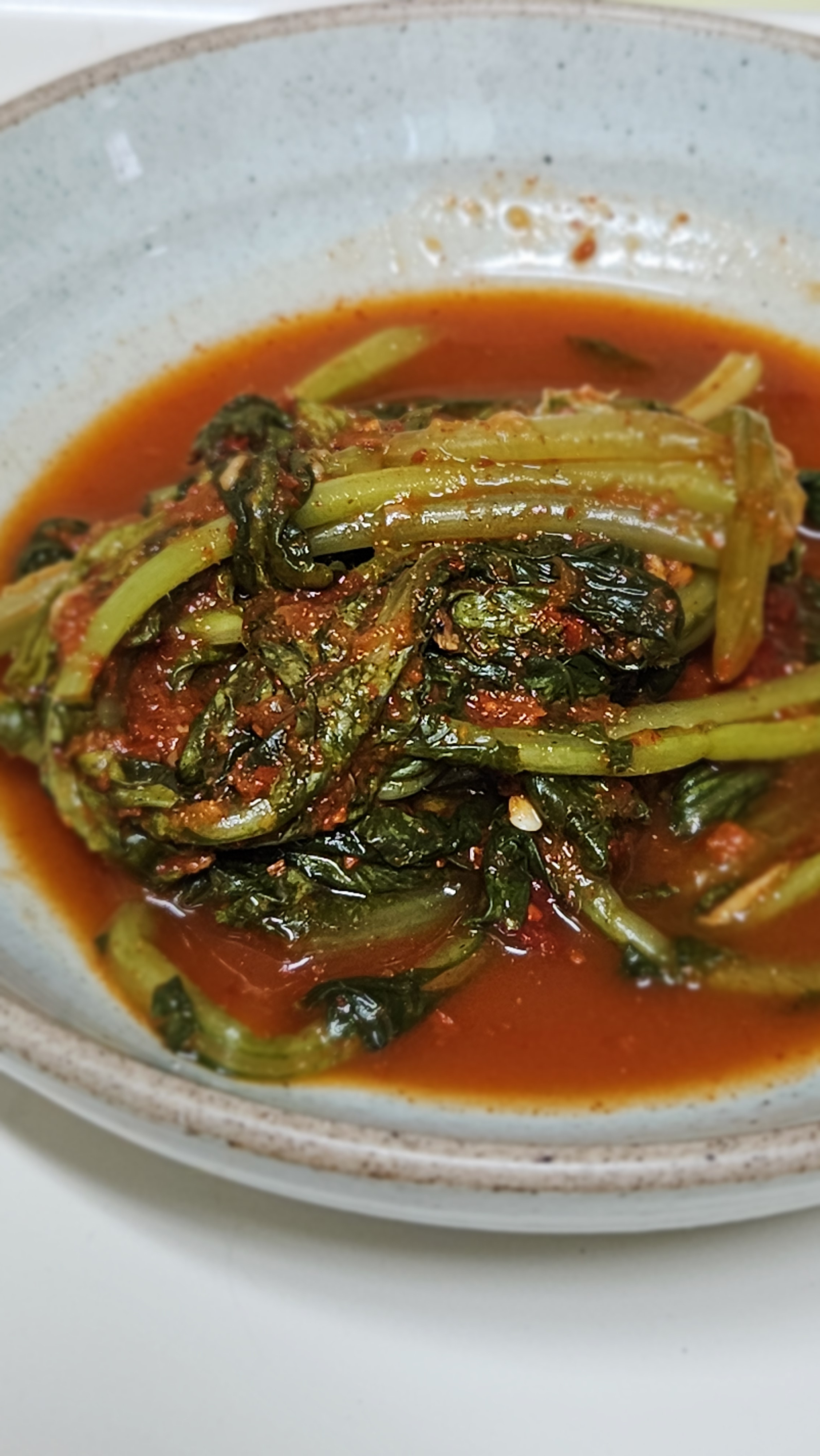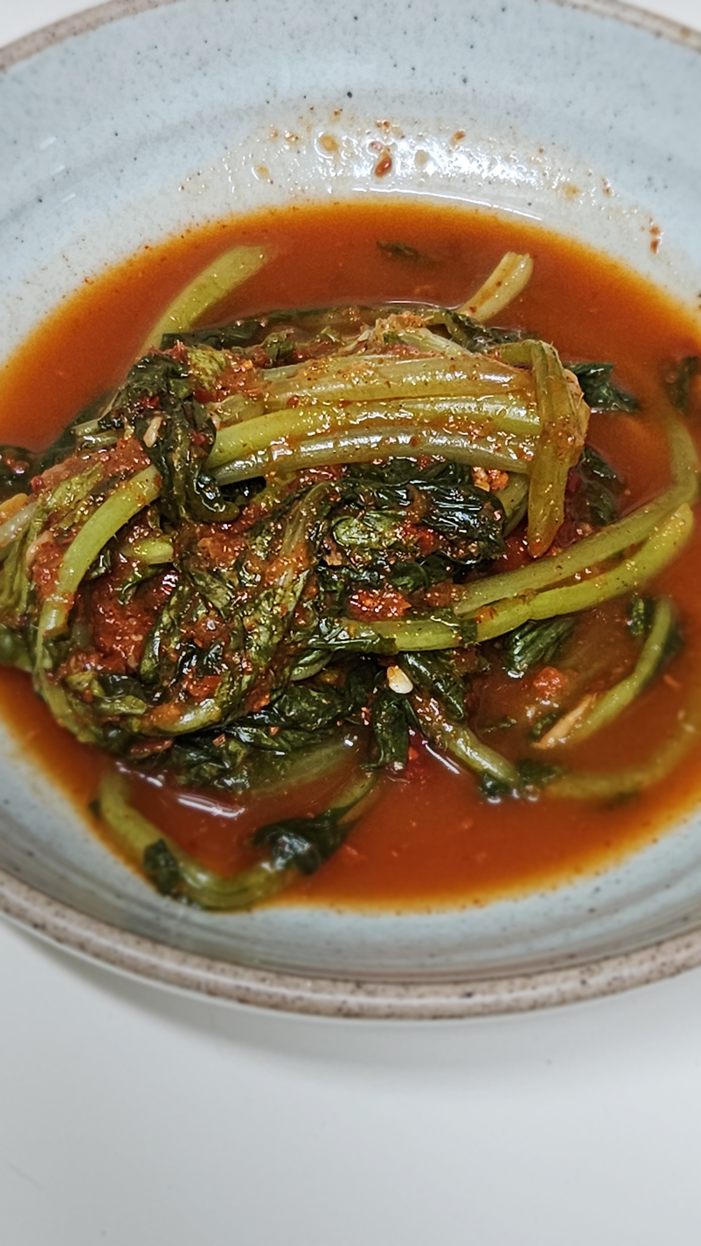 잘 절여진 열무는 물에 3번 정도 헹궈내고 물기 뺀 다음 김치 양념에 버무려줍니다