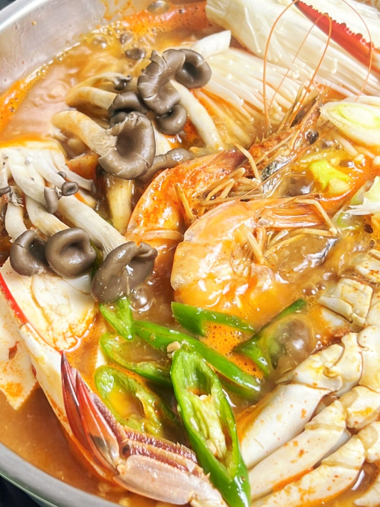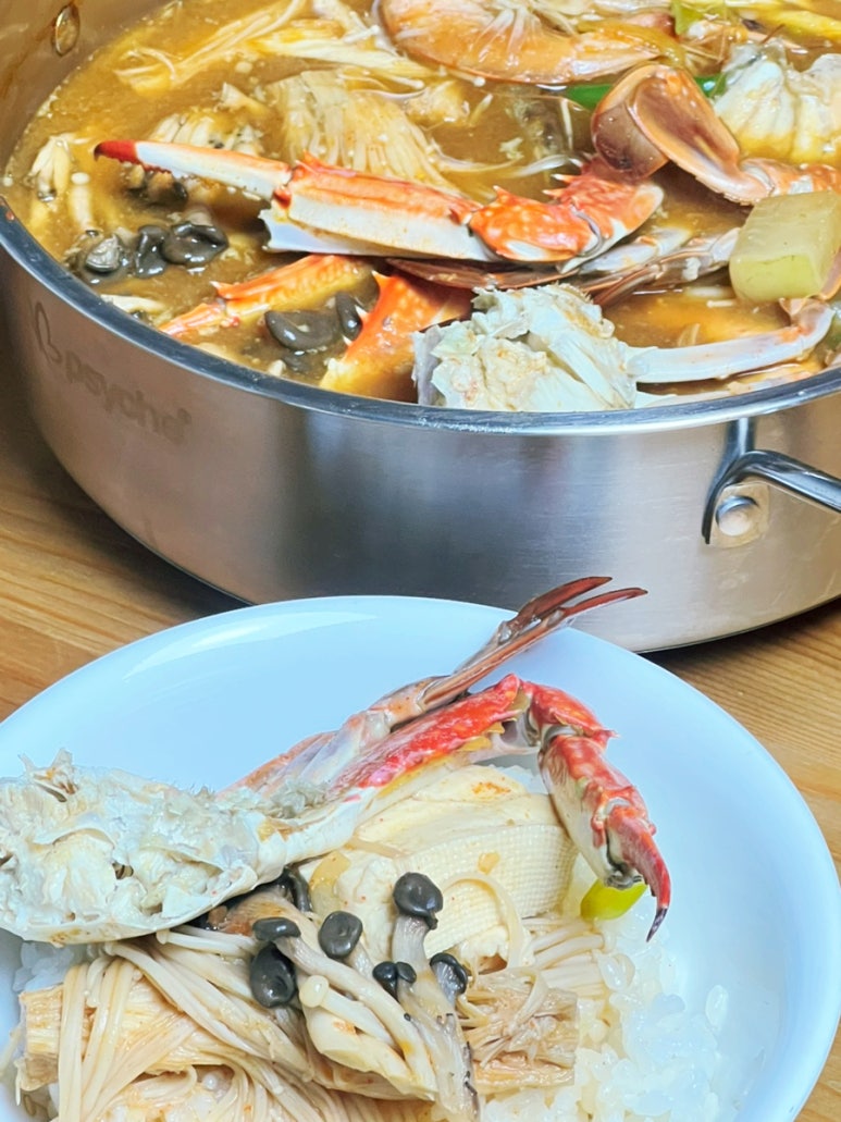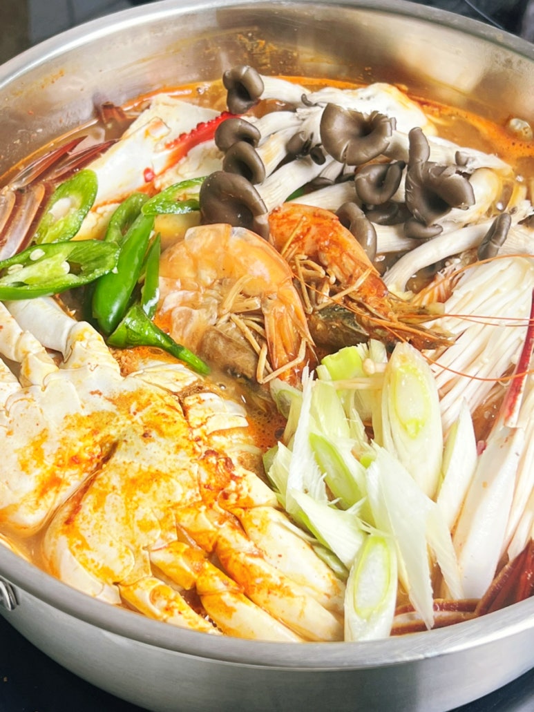 가을 제철 꽃게로 개운하게 맛있는 꽃게탕 만들어 보았어요. 새우와 버섯, 무, 대파 넣어 시원하고 깔끔하게 끓였지요. 칼칼하게 청양고추 넣었더니 느끼함 없이 맛이 좋아요.