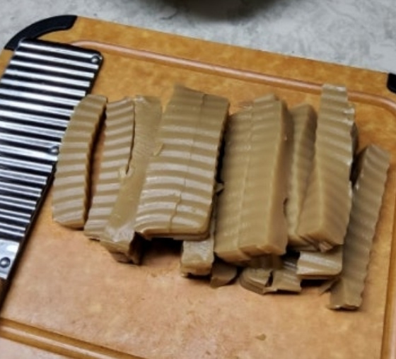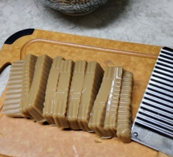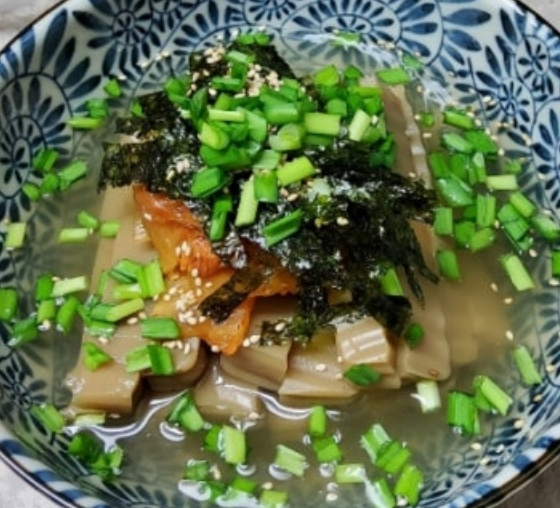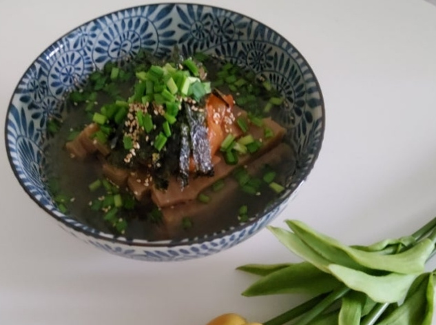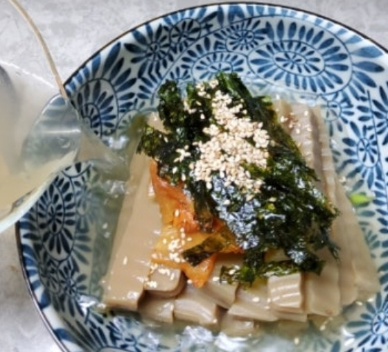 만약 도토리묵이 냉장고에 있다면 끊는물에 소금을 약간만 넣어서 도토리묵을 삶아준후 채반에 받쳐주세요.