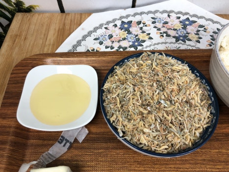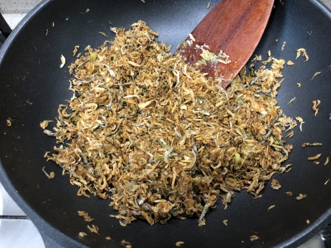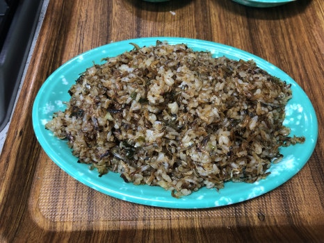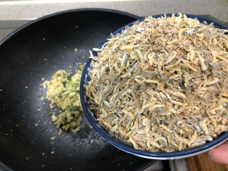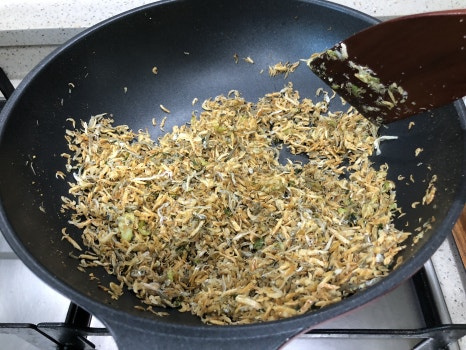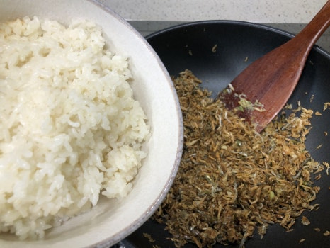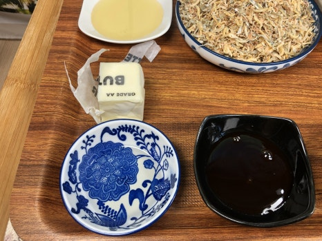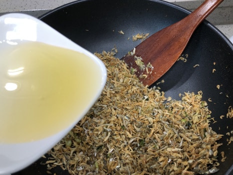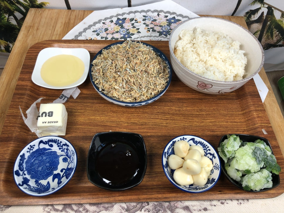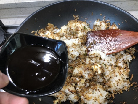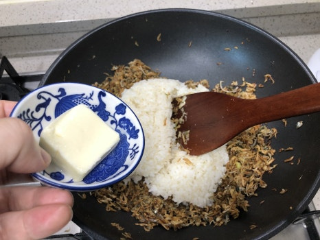 요리당이 밥새우멸치를 잘 코팅했으면 밥(2공기)▶버터(10g)▶굴소스(2스푼)을 넣고 불을 끄고 볶아줍니다.