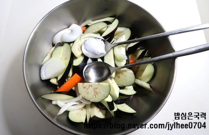 안녕하세요? 밥심은 국력입니다. 가지 좋아하는 분들은 주목해주세요. 가지는 물컹한 식감 때문에 호불호가 있는 식재료인데요. 가지를 살짝 절여서 볶기 때문에 물컹하지 않고 식감이 살아 있어, 밥반찬으로 딱 좋아요. 그럼 부드럽고 쫄깃하게 즐길 수 있는 김진순 가지볶음을 만들어 볼게요.