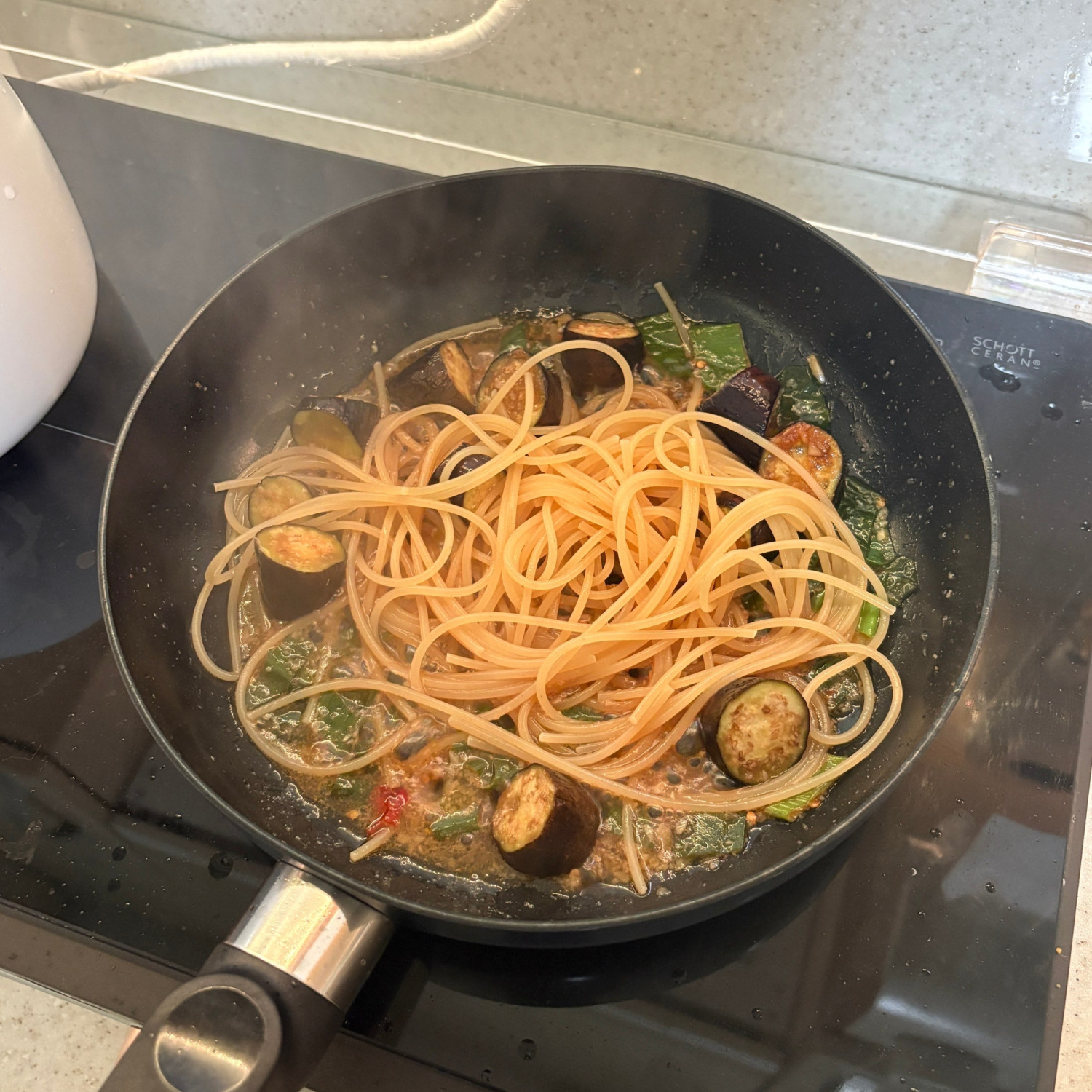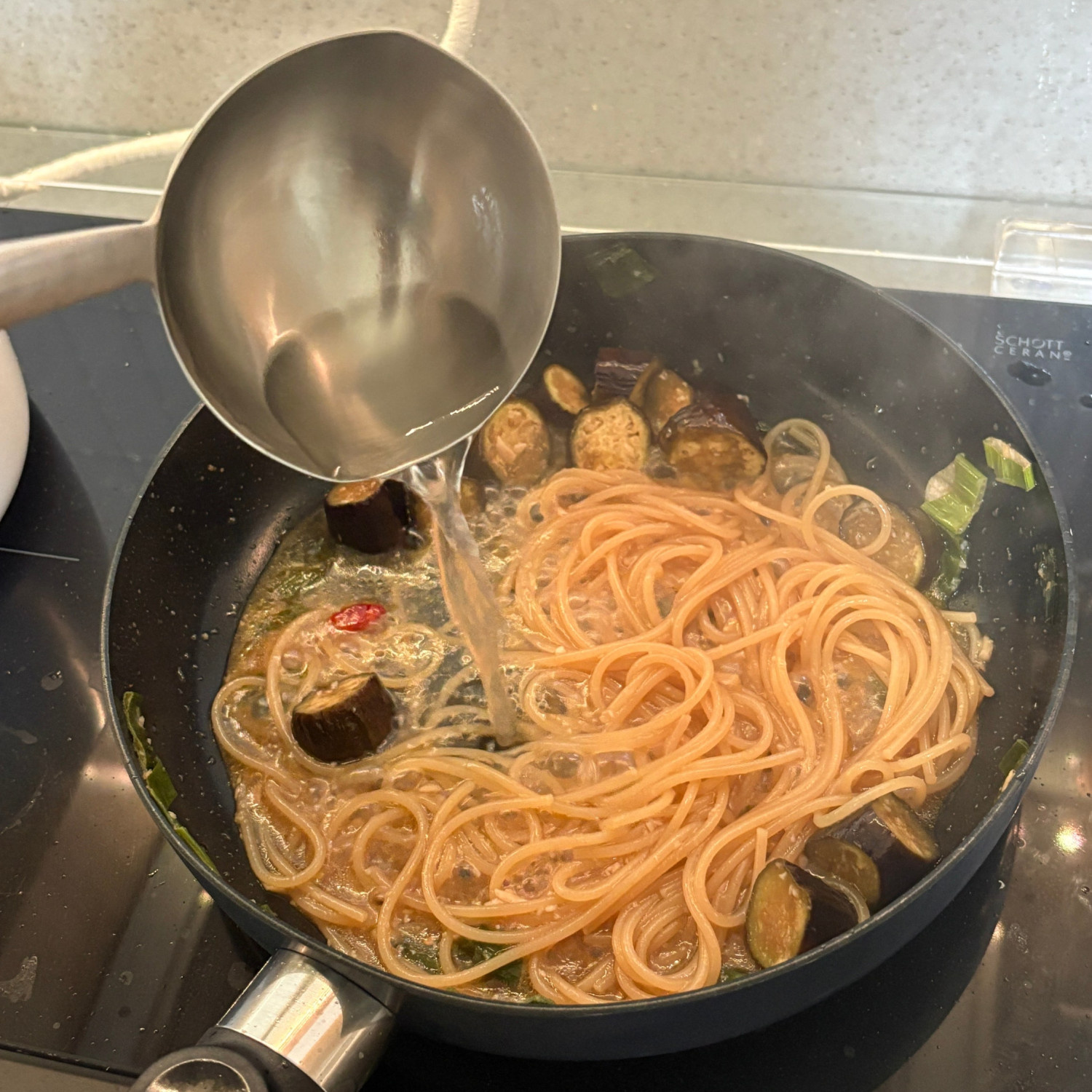 면의 익힘과 소스의 농도를 보며 면수를 추가해 주세요.