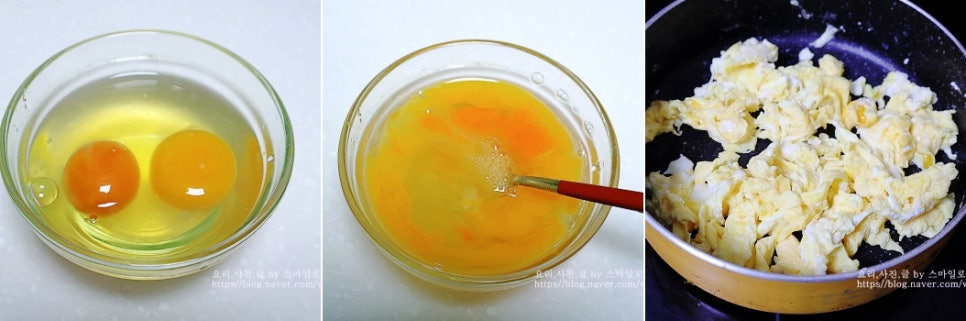 소금 1꼬집 넣고 풀어놓았던 것을 다른 팬에 식용유를 두른 뒤