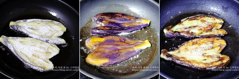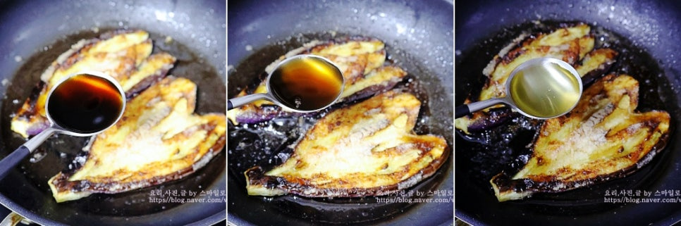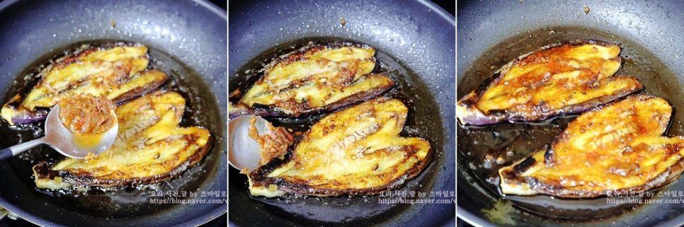 달군 팬에 식용유를 넉넉히 두른 후 가지를 올려서 앞뒤로 노릇노릇 구워줍니다