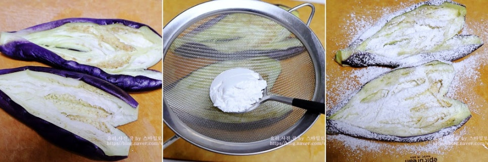 가지를 넓게 펴준 다음 전분가루 1스푼을 체에 올려 골고루 뿌려줍니다