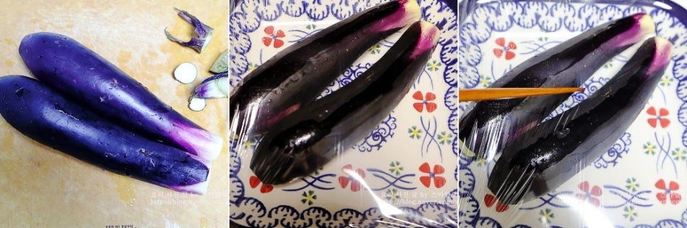 깨끗하게 씻은 가지는 꼭지만 잘라내고 전자레인지 가능한 그릇에 담고