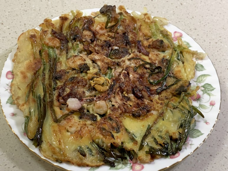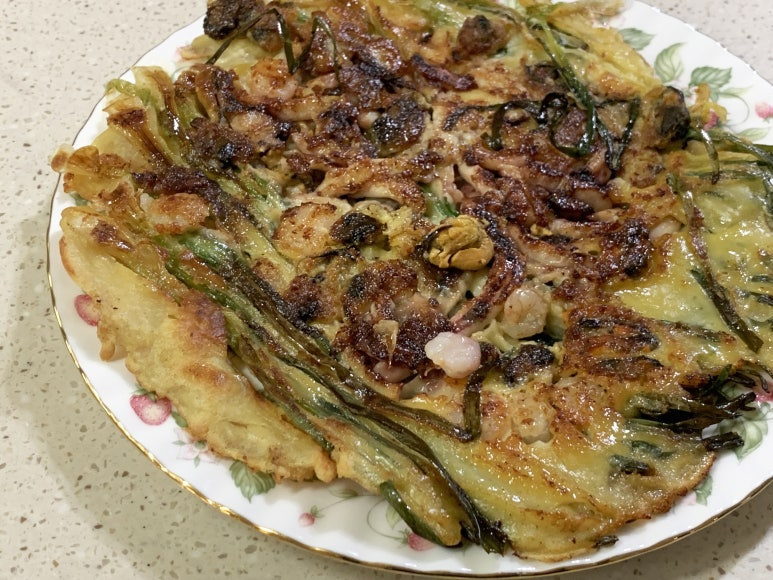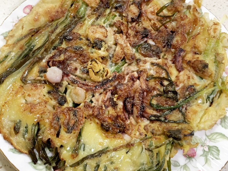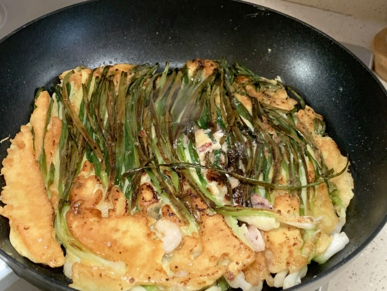 완전히 밑면이 익은 상태로 뒤집어 준 해물파전입니다.