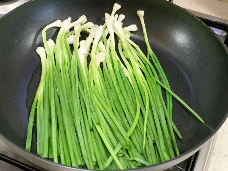 중불에서 달궈진 팬에 기름을 넉넉하게 두르고는 쪽파를 올려 줍니다.