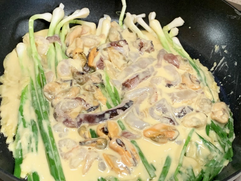 그리고 만들어 놓았던 반죽물을 골고루 쪽파와 해물쪽으로