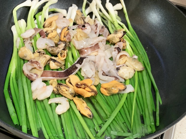 그런 후 해동시킨 해물을 위에 올려 줍니다.