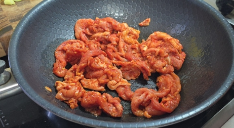 고기가 겹치지 않도록 펼치면서 볶아야 덩어리지지 않고 부드럽게 익습니다.