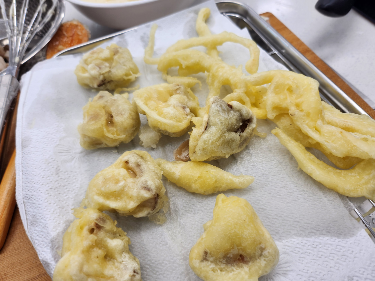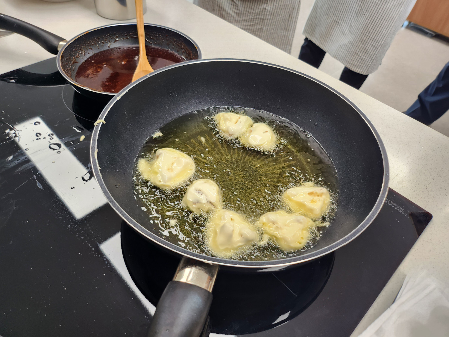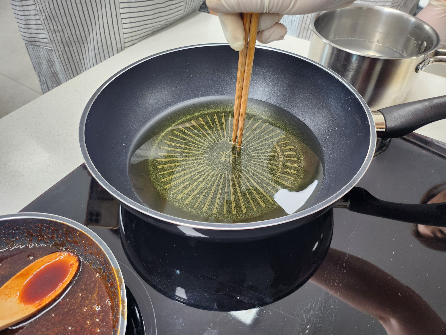 젓가락 주변에서 작은 기포가 빠르게 올라오는걸 확인해서 튀김 온도를 체크합니다!
