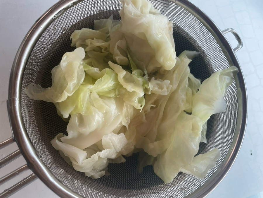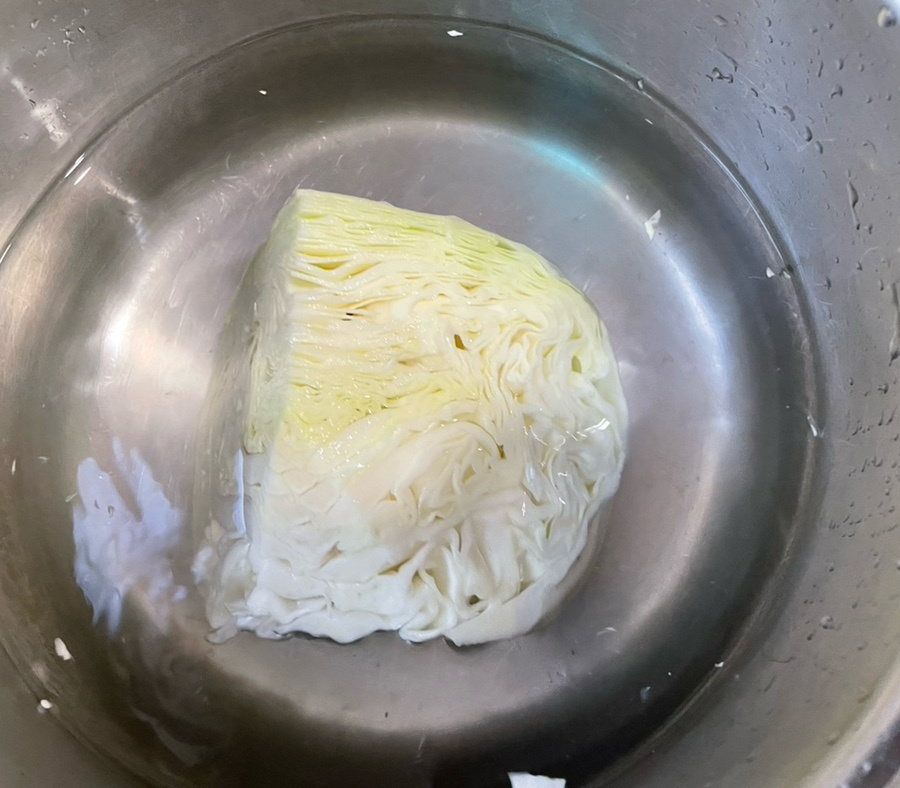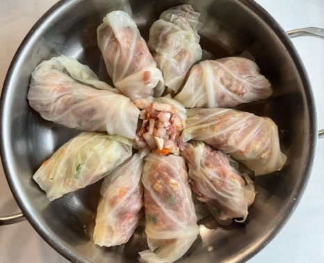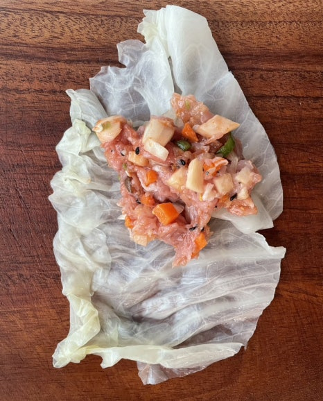 돼지고기 다짐육과 두부 야채를 만두속처럼 잘게 썰어 섞어서 양배추속에 넣고 말아준 뒤