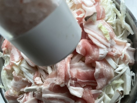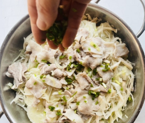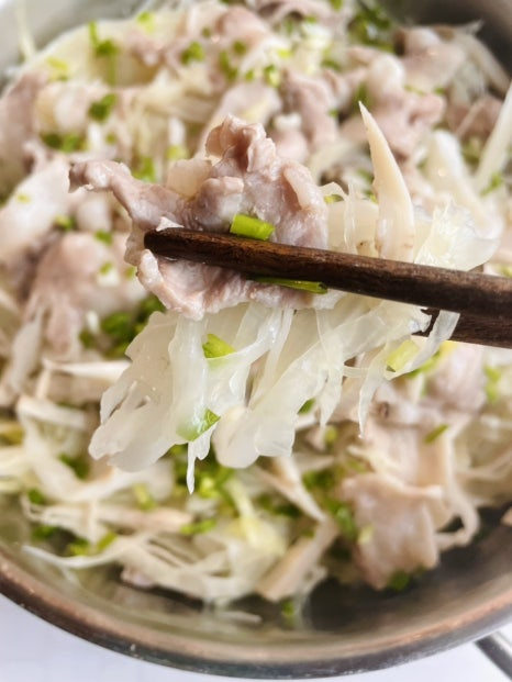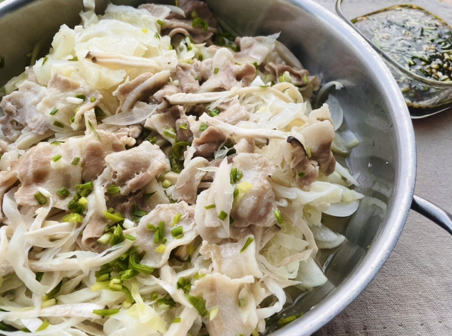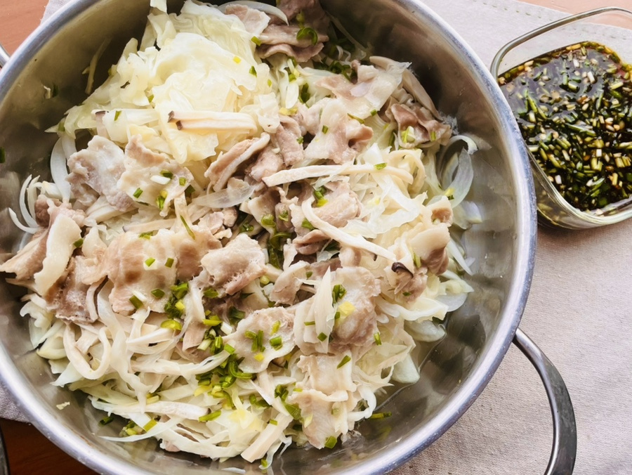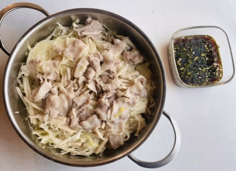 양배추와 삼겹살을 찜기에 넣고 삼겹살의 잡내를 없애기 위해 소주나 맛술을 넣고 쪄낸 뒤 유자 폰즈 소스를 만들어 찍어 먹는데 요 소스가 이 요리의 킥이더라구요.