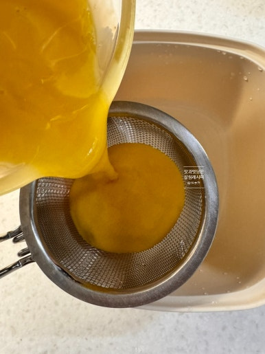 마지막으로 잘 내려가지 않는 부분은 채망 안에서 풀어주면서 내려주고요. 마지막 걸러지지 않는 알끈 등은 버려주도록 해요.