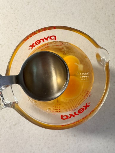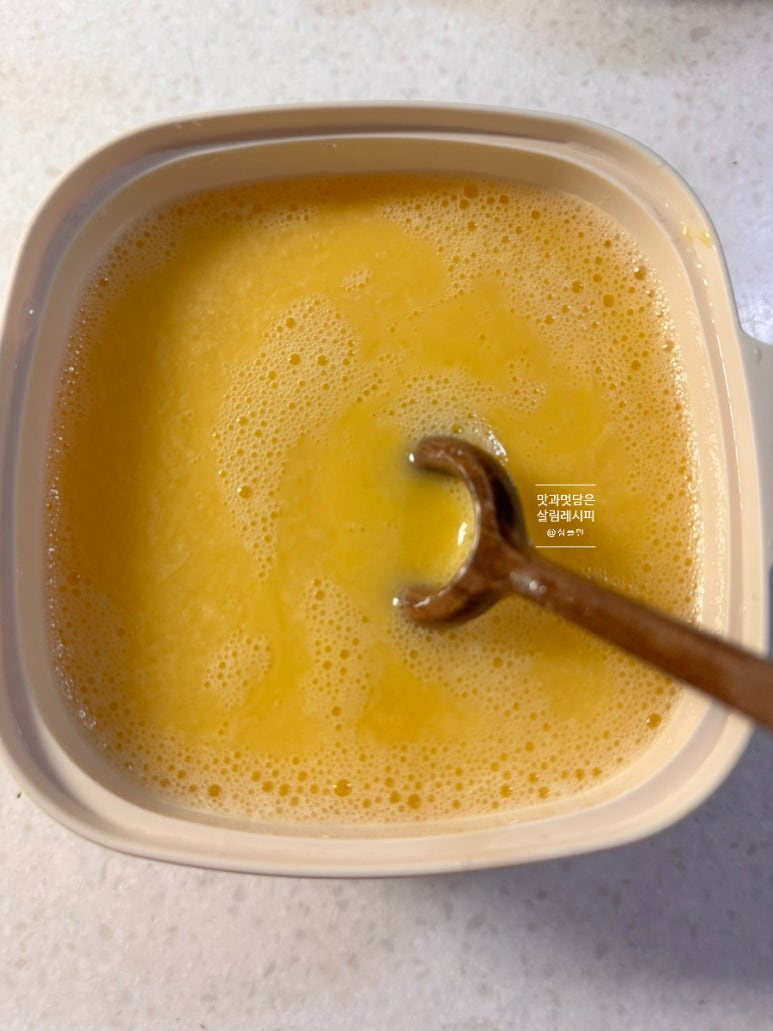 껍질을 깨서 풀어주어야 하기에 넉넉한 용기에 넣어줍니다. 감칠맛 나는 간을 맞춰주는 쯔유 2/3큰술과 비릿한 맛을 잡아줄 미림 1큰술 넣어주세요. 쯔유 대신 참치액으로 대체해 주어도 좋아요.