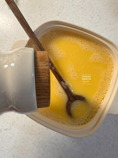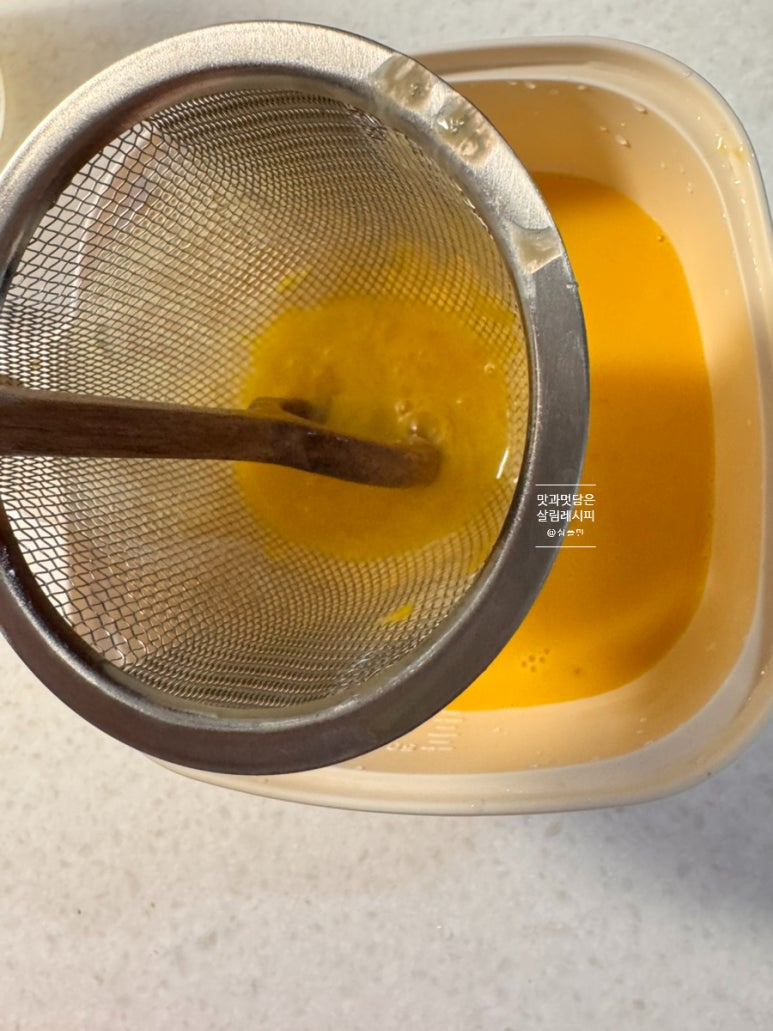 촉촉하면서 부드러운 푸딩스타일로 만들기 위해서는 먼저 곱게 잘 풀어주는 것이 중요해요. 노른자와 흰자가 고루 섞이기 위해 잘 풀어준 뒤에는 채망에 한번 걸러 알끈 등을 제거해 주도록 합니다.