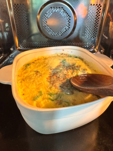 각 집마다 사양이 다르지만 일반적으로 총 7분 정도 익혀주면 찰랑찰랑 촉촉하게 잘 익습니다. 저는 두 차례로 나누어 익히는데요. 먼저 4분 돌려줄게요. 4분 익힌 모습이에요. 아직 안쪽 부분은 정말 익지 않은 상태로 찰랑찰랑 요동칩니다. ^^ 완전히 익으면 좀 더 단단한 느낌이 확 들어요.