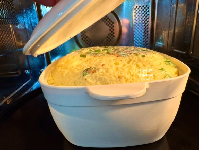 2차로 3분 더 돌려주었어요. 이제 안까지 완전히 익어 봉긋하게 솟아오르며 촉촉 부드러운 푸딩달걀찜이 완성되었어요. 부드러운 푸딩 느낌으로 한입씩 떠서 쏙쏙 넣으면 입안에서 사르르 녹아요. 아이들은 밥에 푸짐하게 넣고 쓱쓱 비벼 먹기도 합니다. 간을 짭짜름하게 하면 단품 메인 반찬으로 비벼 먹기 좋고요. 메인 요리와 곁들여 먹을 땐 좀 삼삼하게 간을 맞추는 것을 추천합니다.