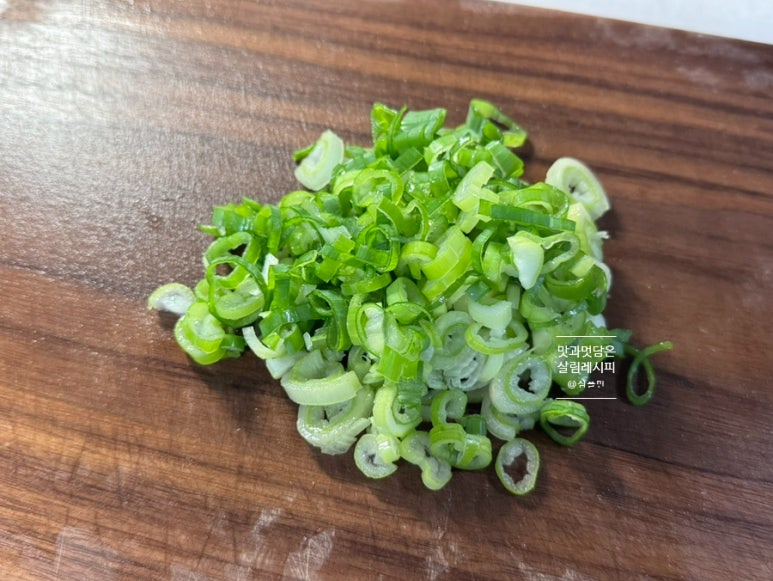 양념재료와 함께 버무릴 파 송송 썰어주는데요. 대략 반대 정도 썰어주면 4~5큰술로 넣을 수 있어요. 잘게 썰어줍니다.