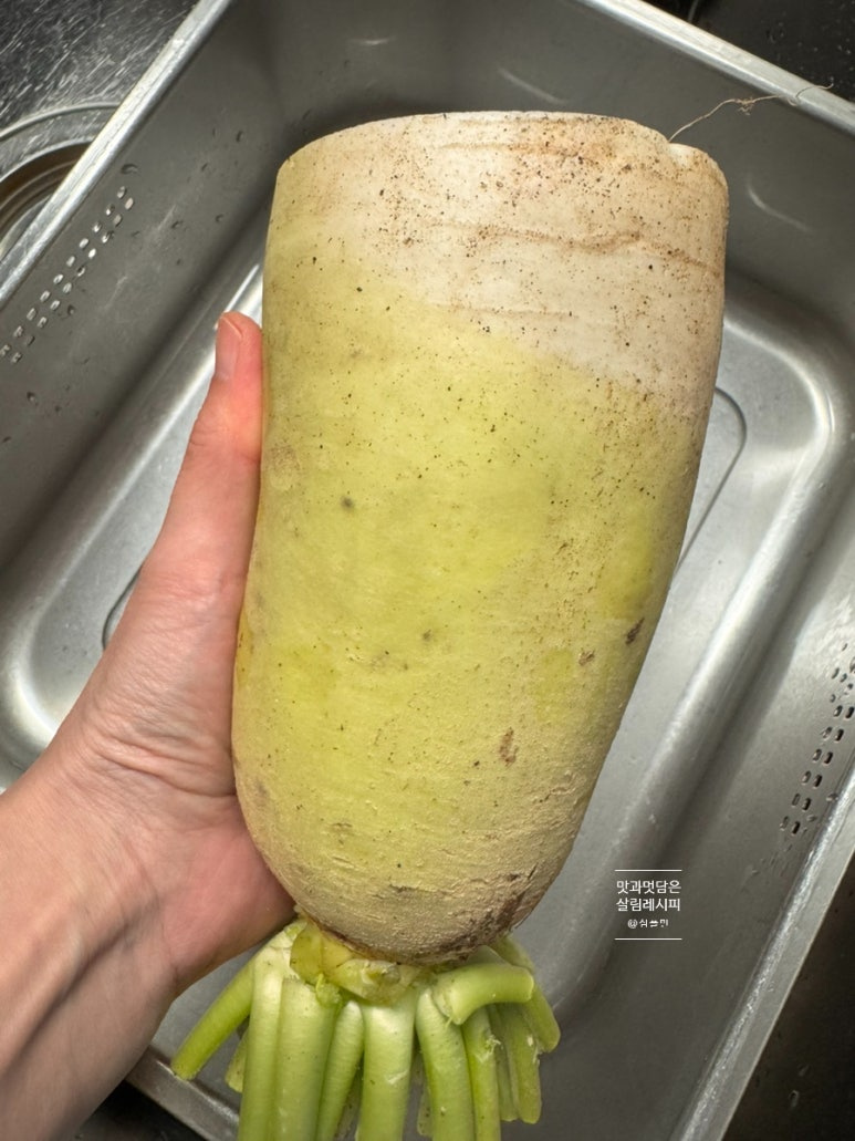 일반적인 무 사이즈로 반 뚝 자르면 대략 500~600g의 양이 되어요. 이 양 기준으로 만들면 적당하고요. 앞서 말한 바와 같이 초록 부분이 단맛이 더 강하기 때문에 생으로 먹을 때 더욱 좋습니다. 껍질 부분에 비타민 영양소가 많기 때문에 최대한 살려 모두 섭취하는 것이 좋아요. 상처 난 부분만 깎아내고 깨끗이 씻어 껍질 부분까지 모두 활용해 주었습니다.