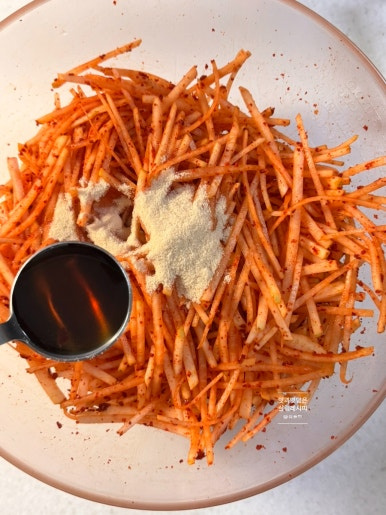 고춧가루로 버무린 뒤 위 재료를 넣어줍니다. 액젓은 멸치나 까나리 등 무방해요. 또한 감칠맛을 더해주는 참치액과 섞어 넣어도 좋습니다.
