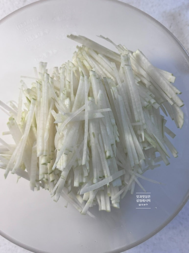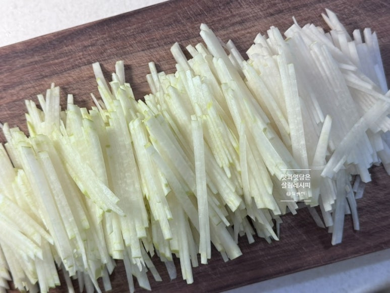적당한 폭으로 채 썰어줍니다. 0.3cm 정도의 폭으로 썰면 적당해요. 씹히는 식감 선호에 따라 취향에 맞게 썰어주세요.