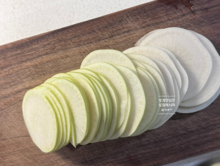 채칼을 써도 좋고요. 저는 직접 썰어주었어요. 먼저 둥근 모양으로 얇게 썰어내고요.