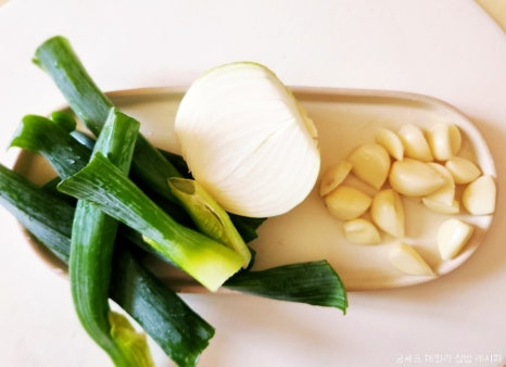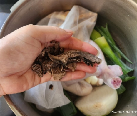 물 450ml를 붓고 양파, 대파, 통마늘, 건능이버섯과 소금 반큰술도 같이 넣어 주세요.