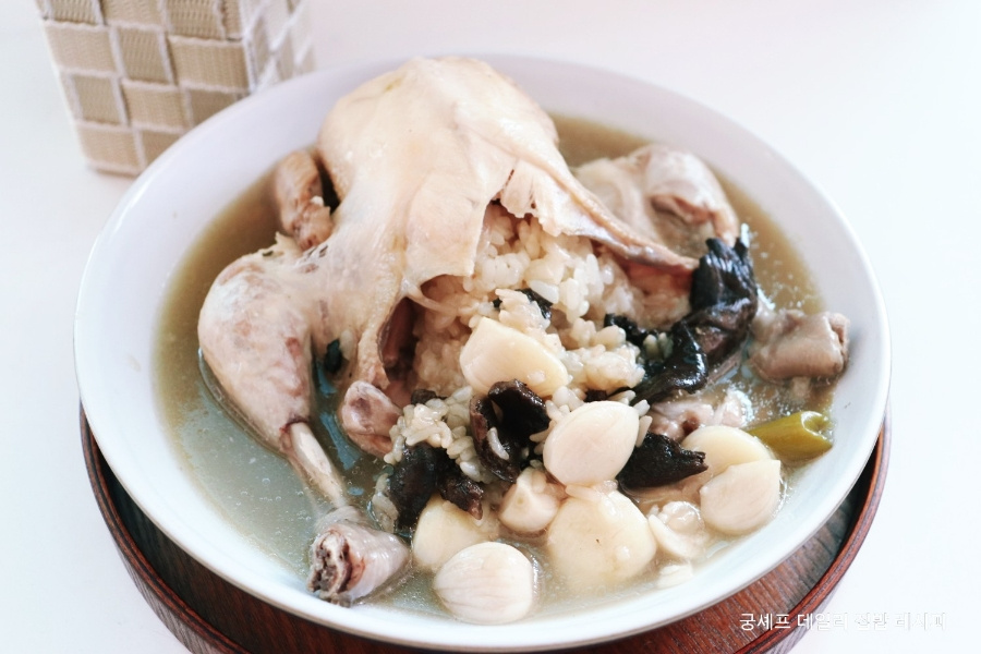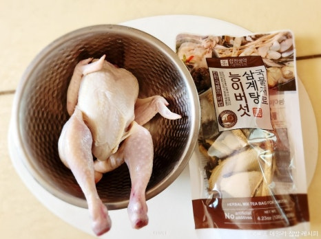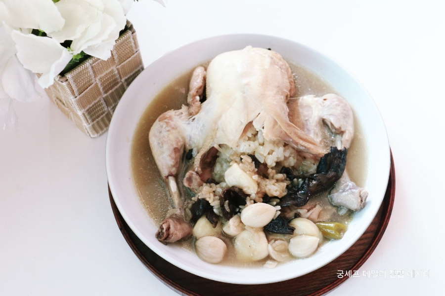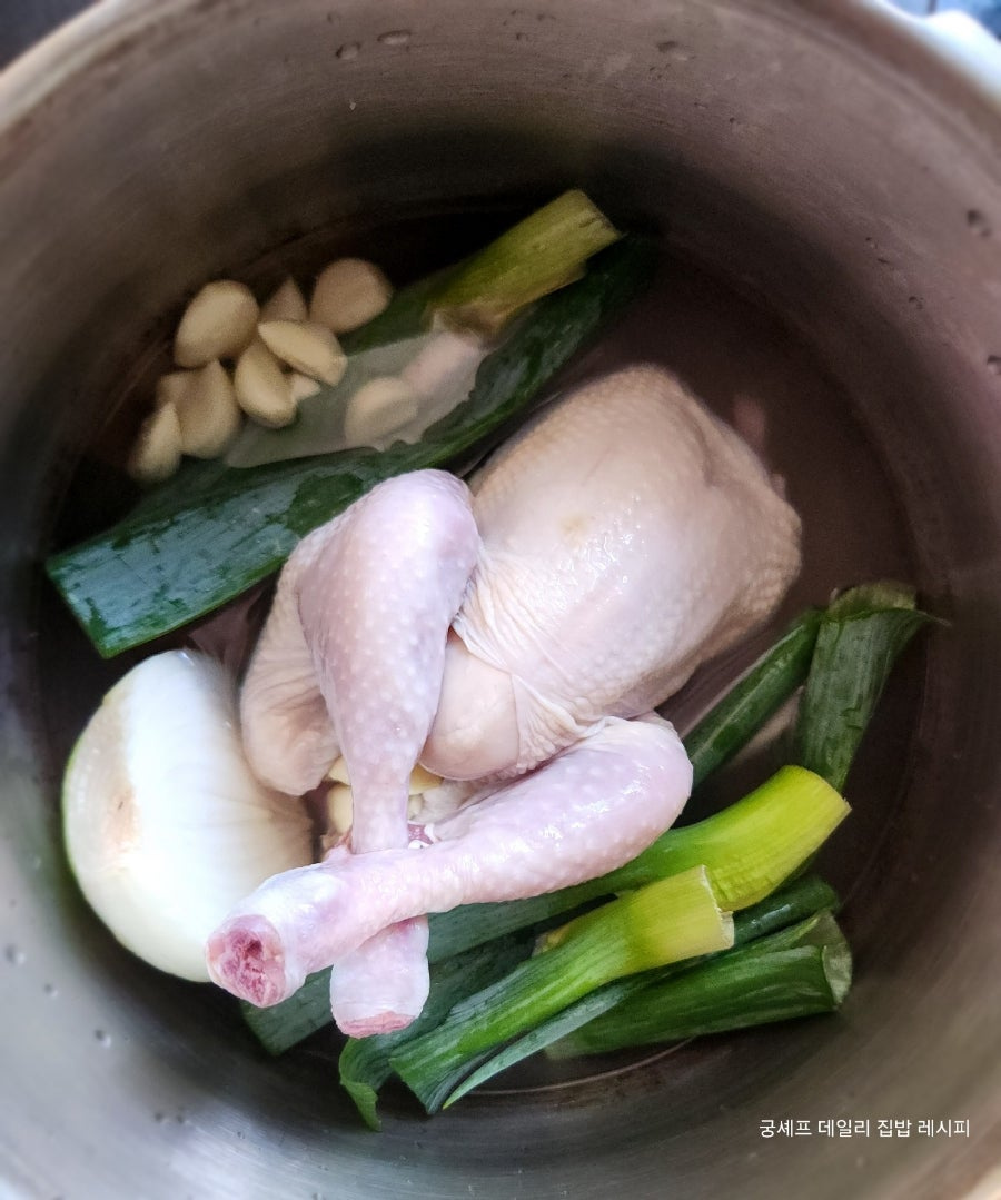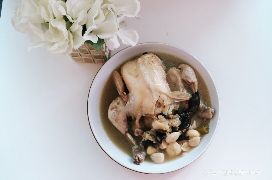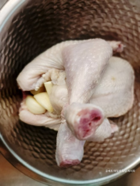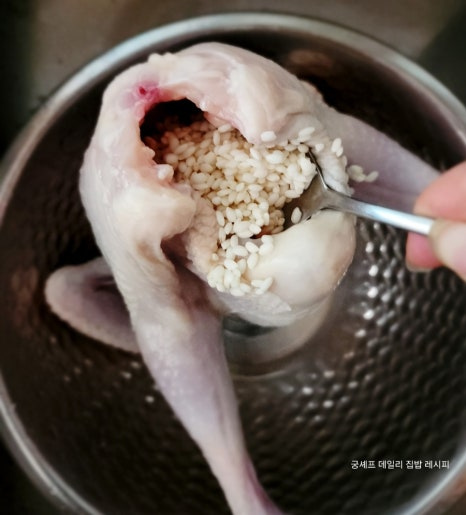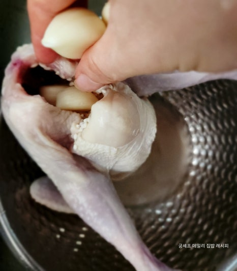 손질한 닭 속에 찹쌀 3큰술과 통마늘 6개을 넣었어요.